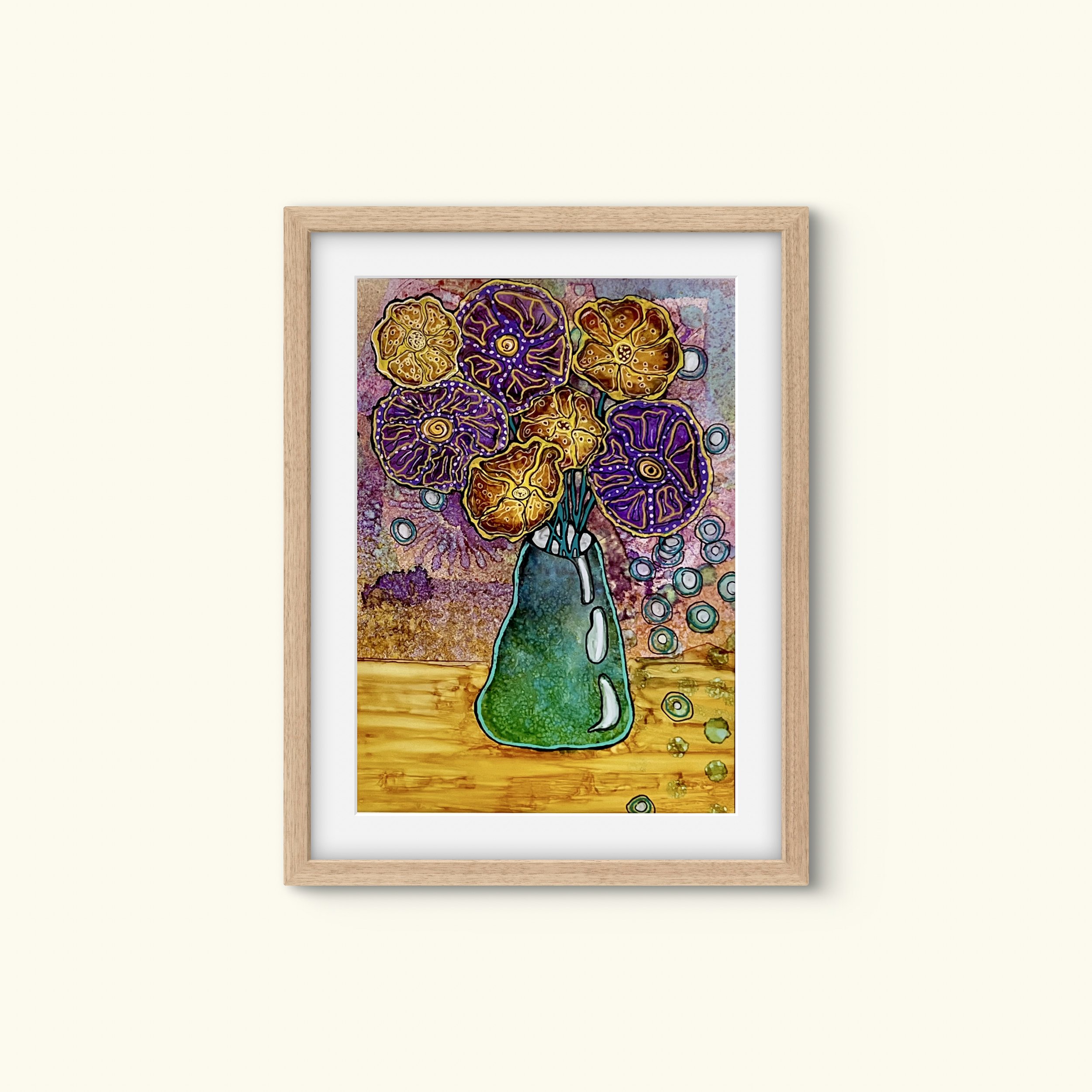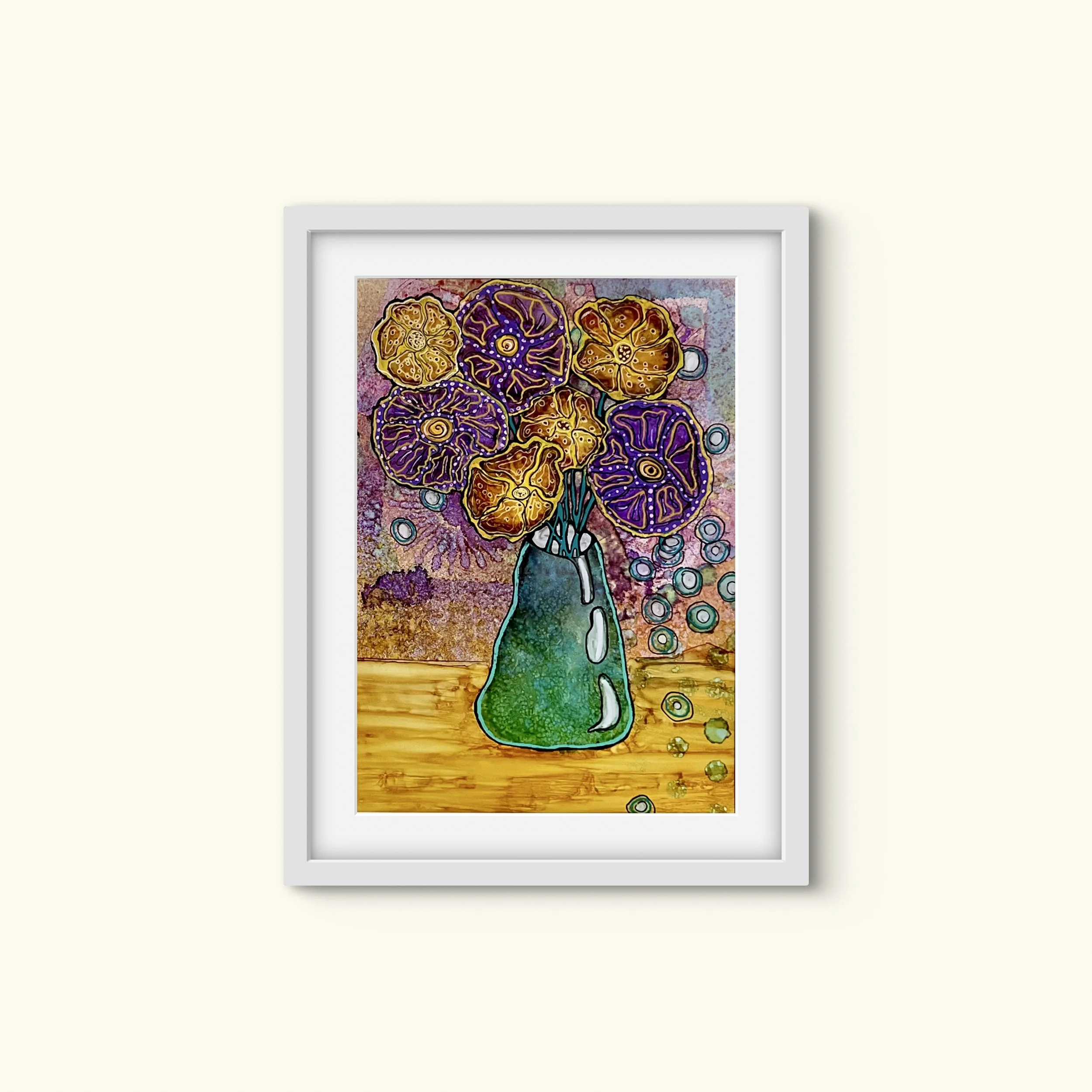 A joyful burst of colour and spontaneity, these one-of-a-kind drawings are created using alcohol ink and acrylic paint pen on smooth A4 vinyl board. With fluid movement and blooming forms, each piece captures the delicate balance between control and chaos — a dance between vibrant ink and crisp linework. Bold, floral, and bursting with personality, they bring a touch of playful elegance to any space.