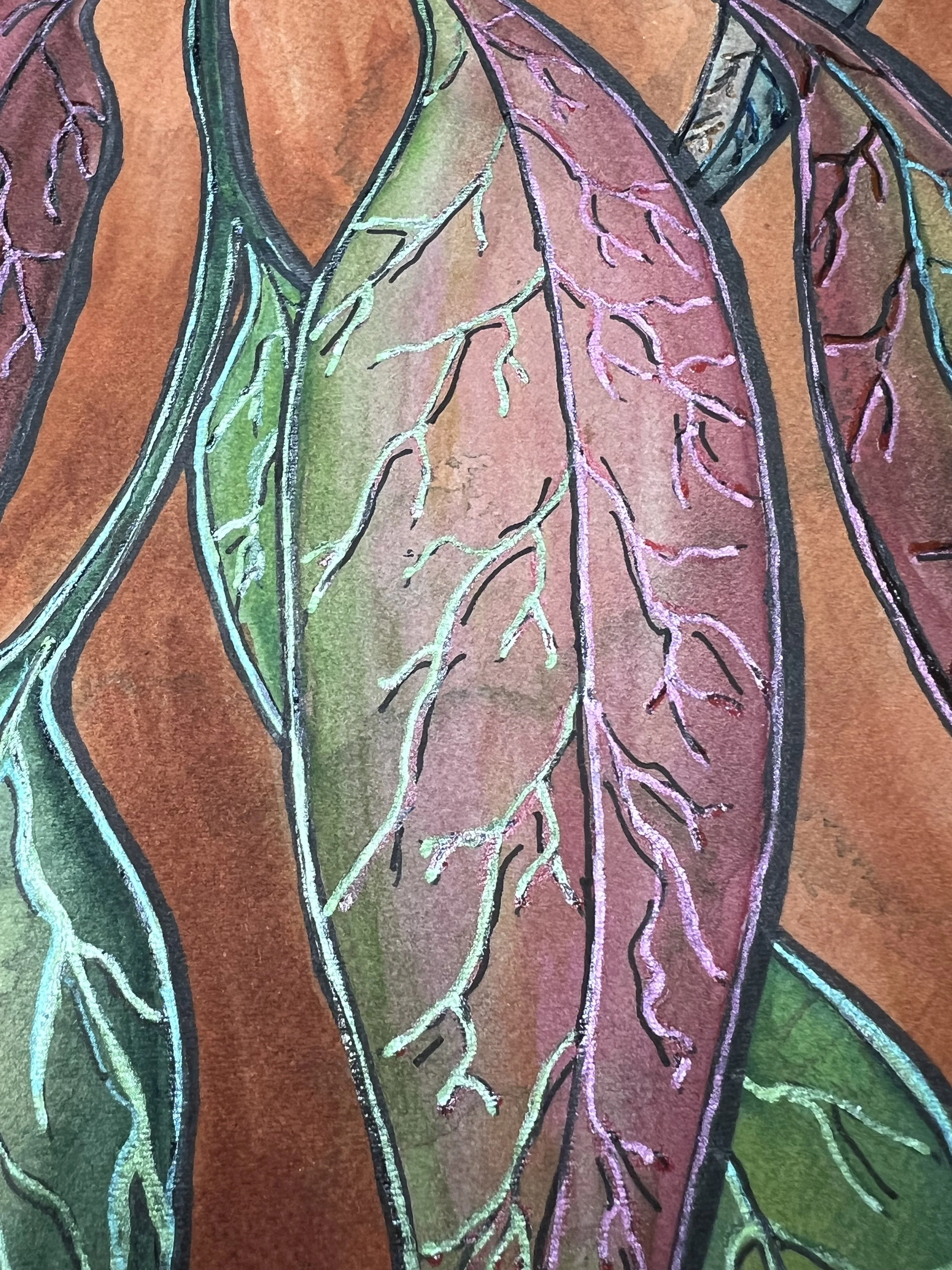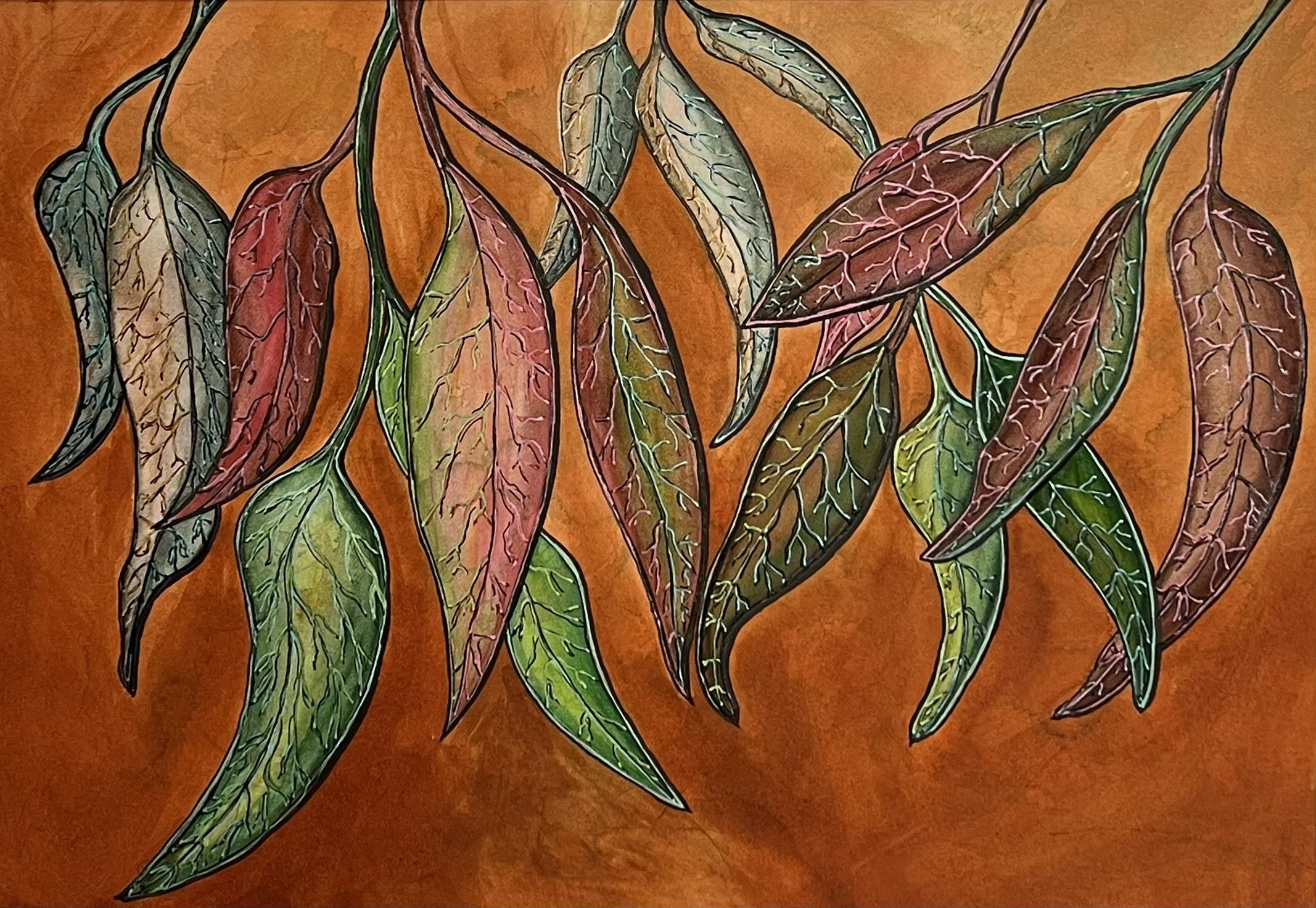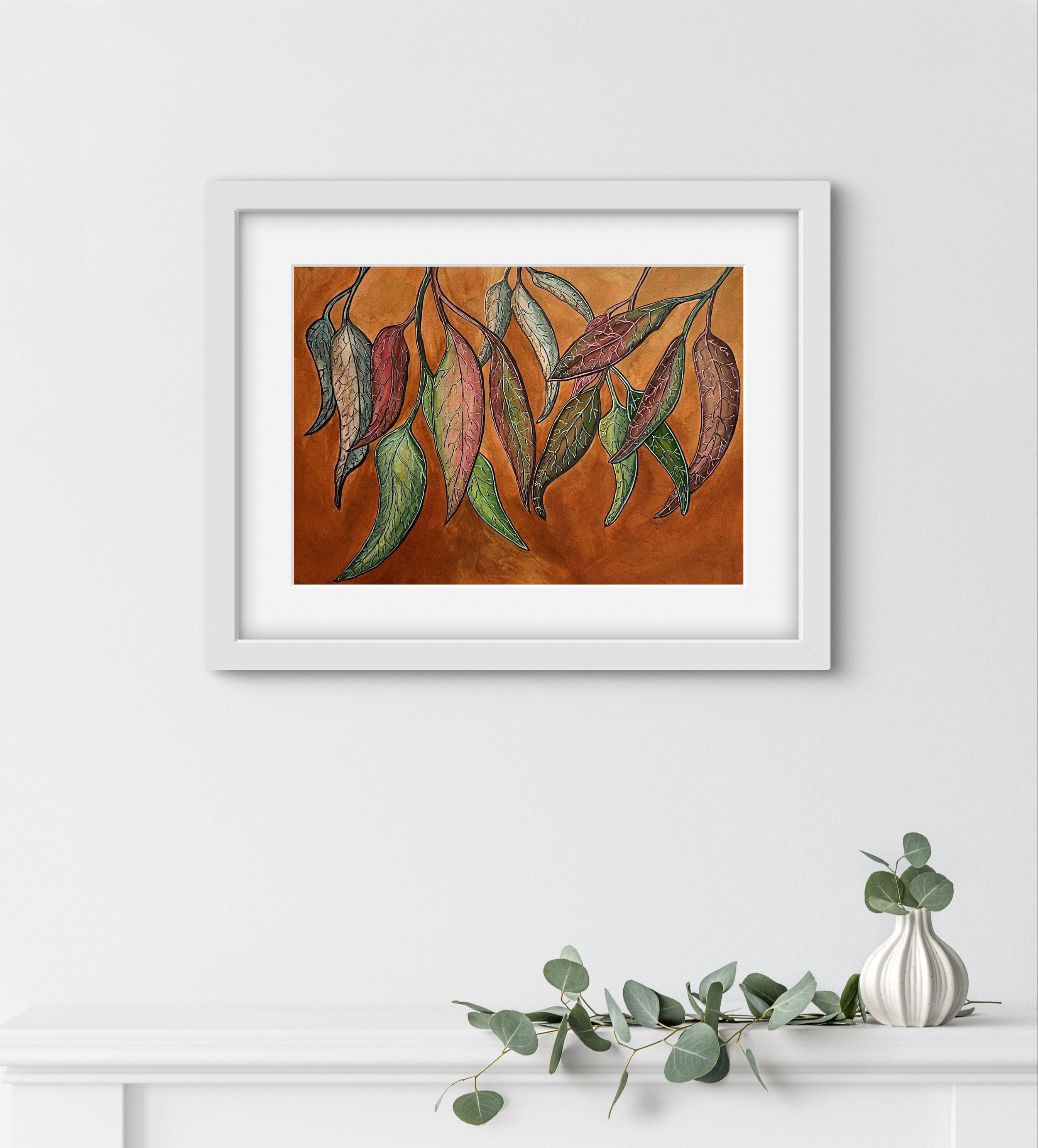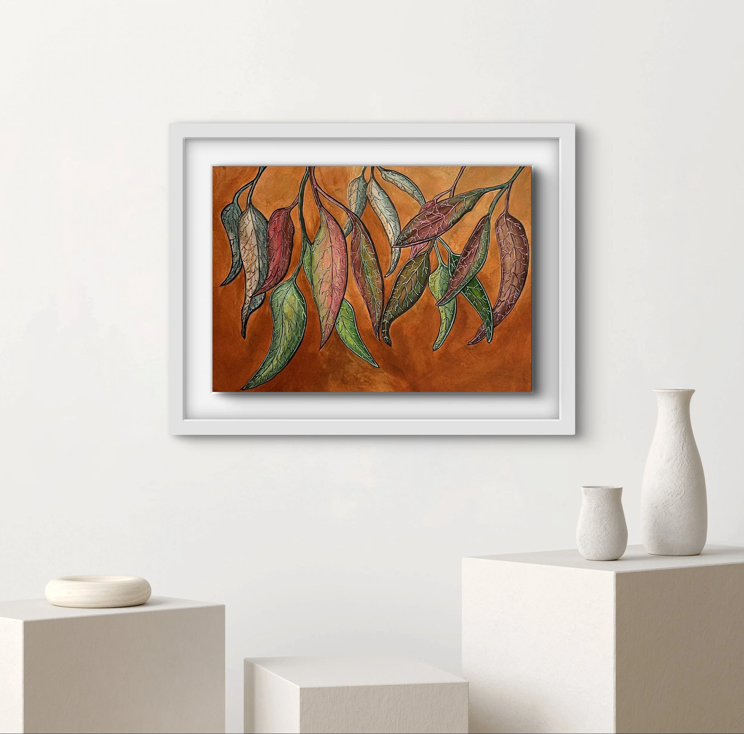 Amber Sky is the second in the series, and it brings a warmer, almost glowing dusk energy. The eucalyptus leaves here feel like they’re catching the very last light of the day — a kind of suspended breath. The amber tones add a quiet intensity, a sense of earthy reverence. Same composition, new mood. Like the leaves are remembering something.