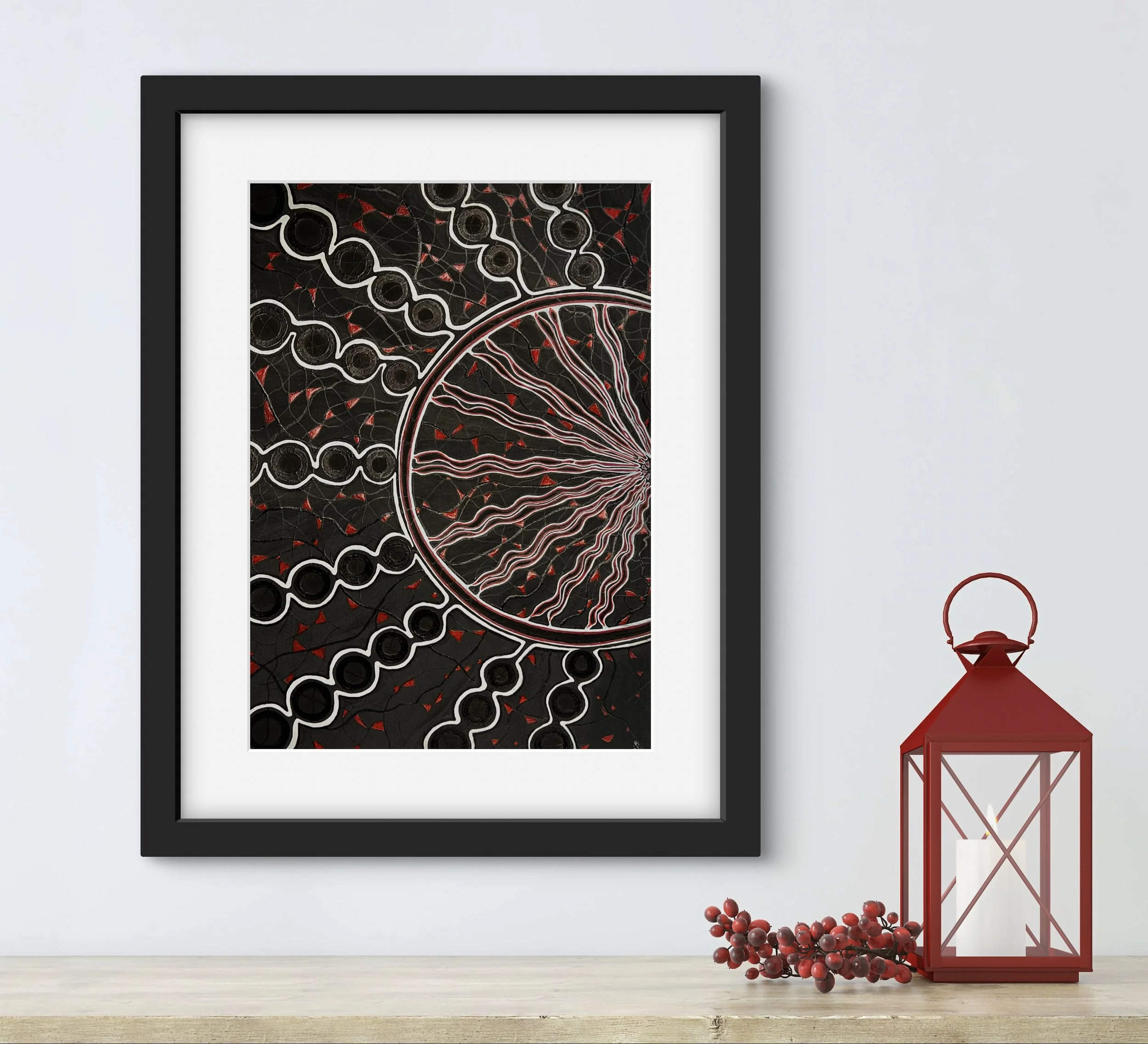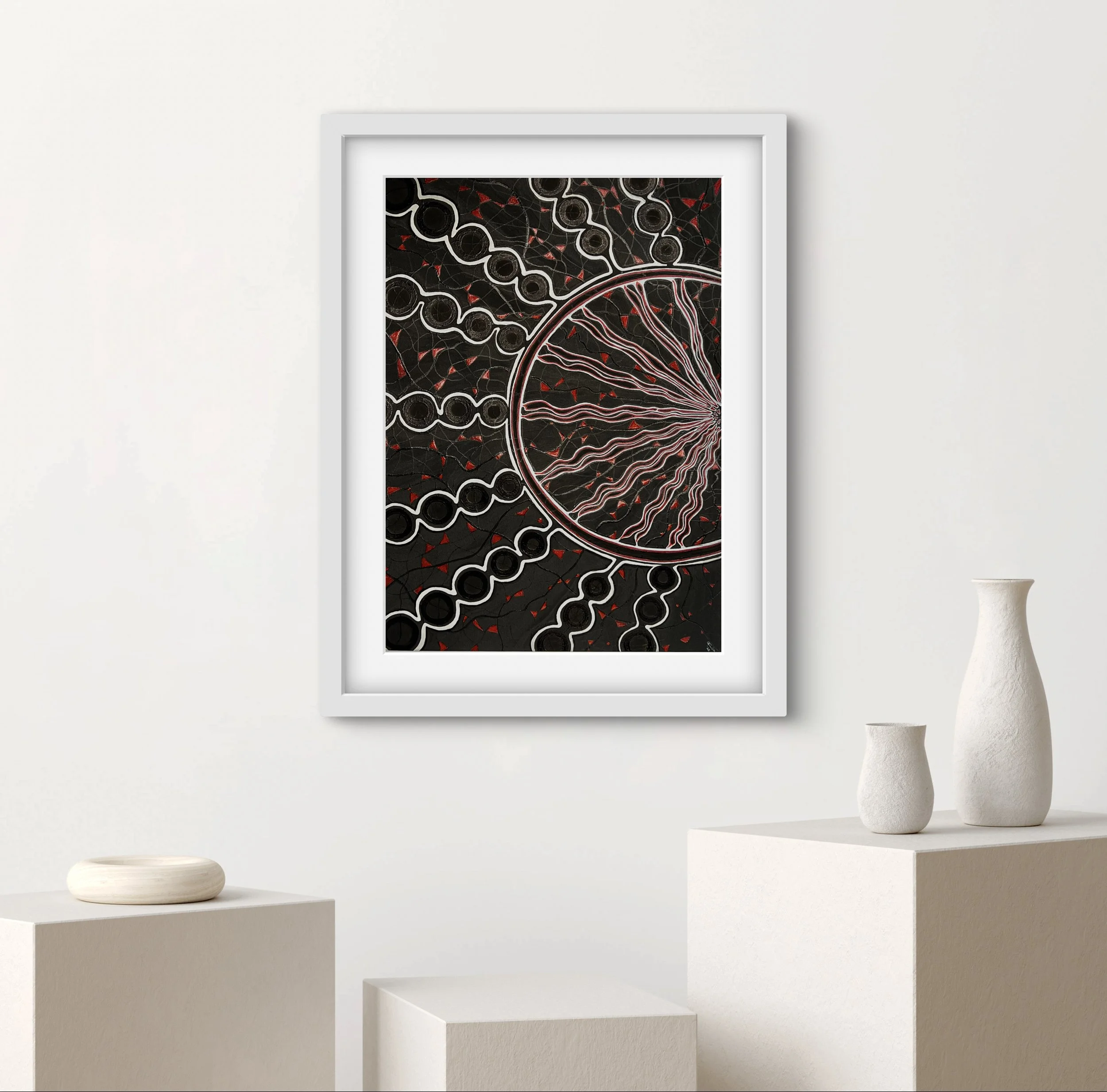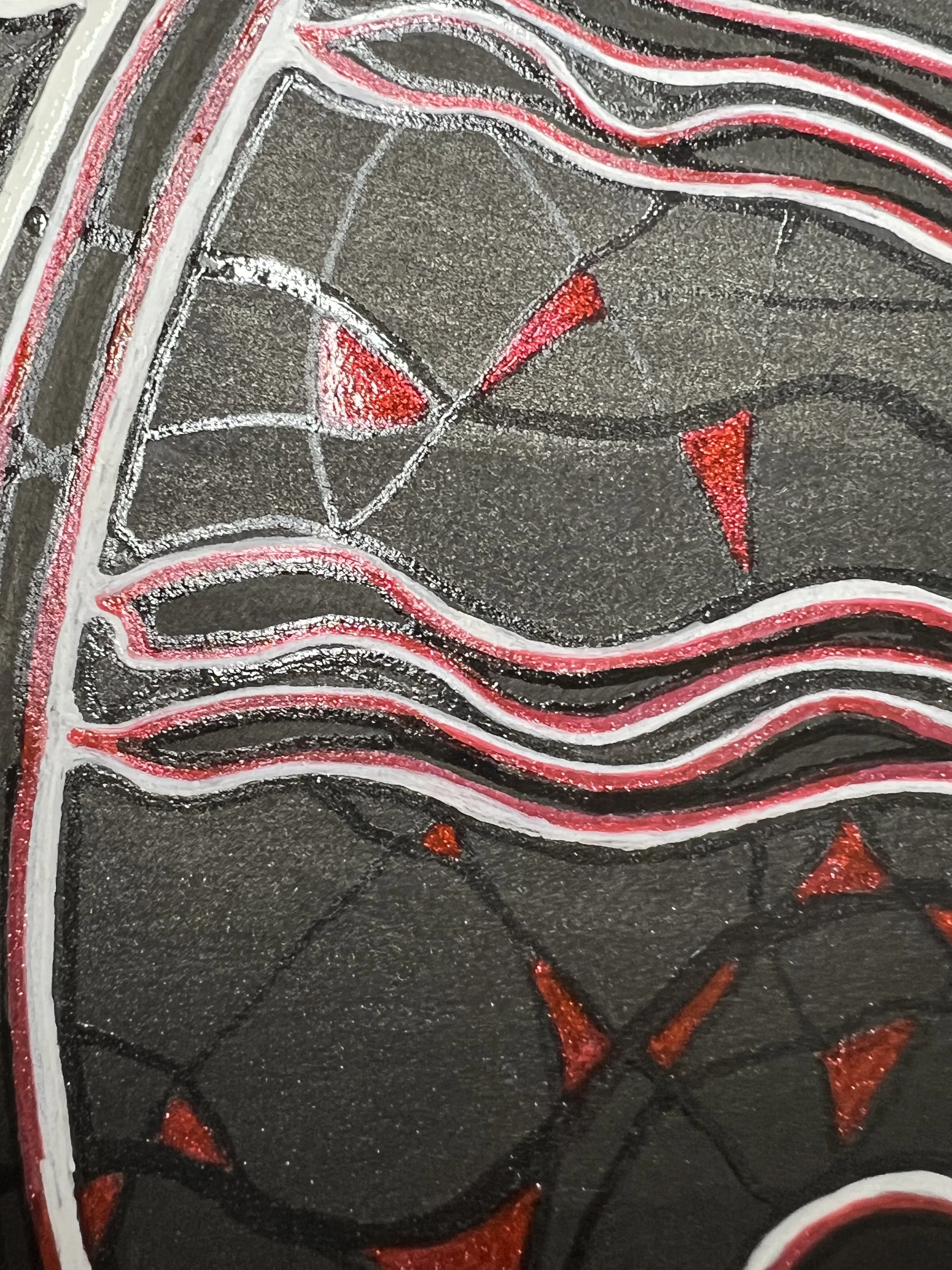 This piece emerged as a visual reckoning with the lingering grip of ego—the part of us that whispers doubts, manufactures fear, and clings to control. The circular form is almost like a force-field, containing both the chaos of red sparks and the flow of thought spirals reaching outward. It’s a question in motion: How much power does ego hold when left unchecked? A reminder that awareness is the first step to loosening its grip.