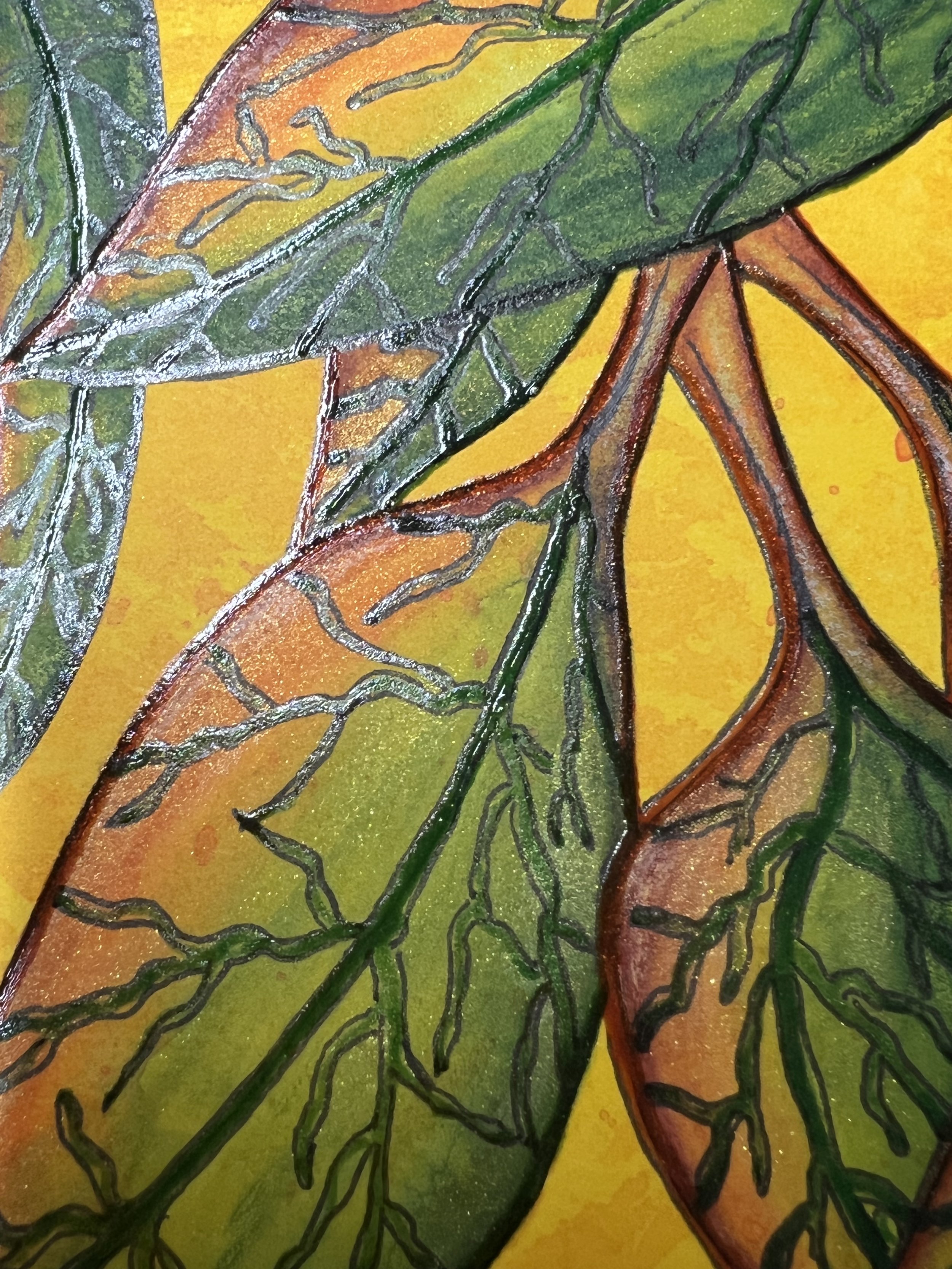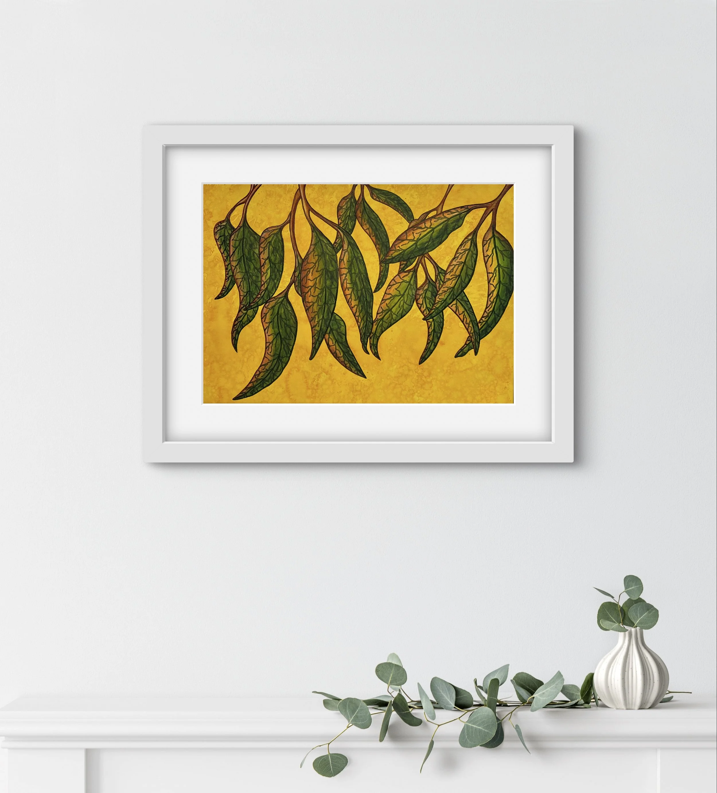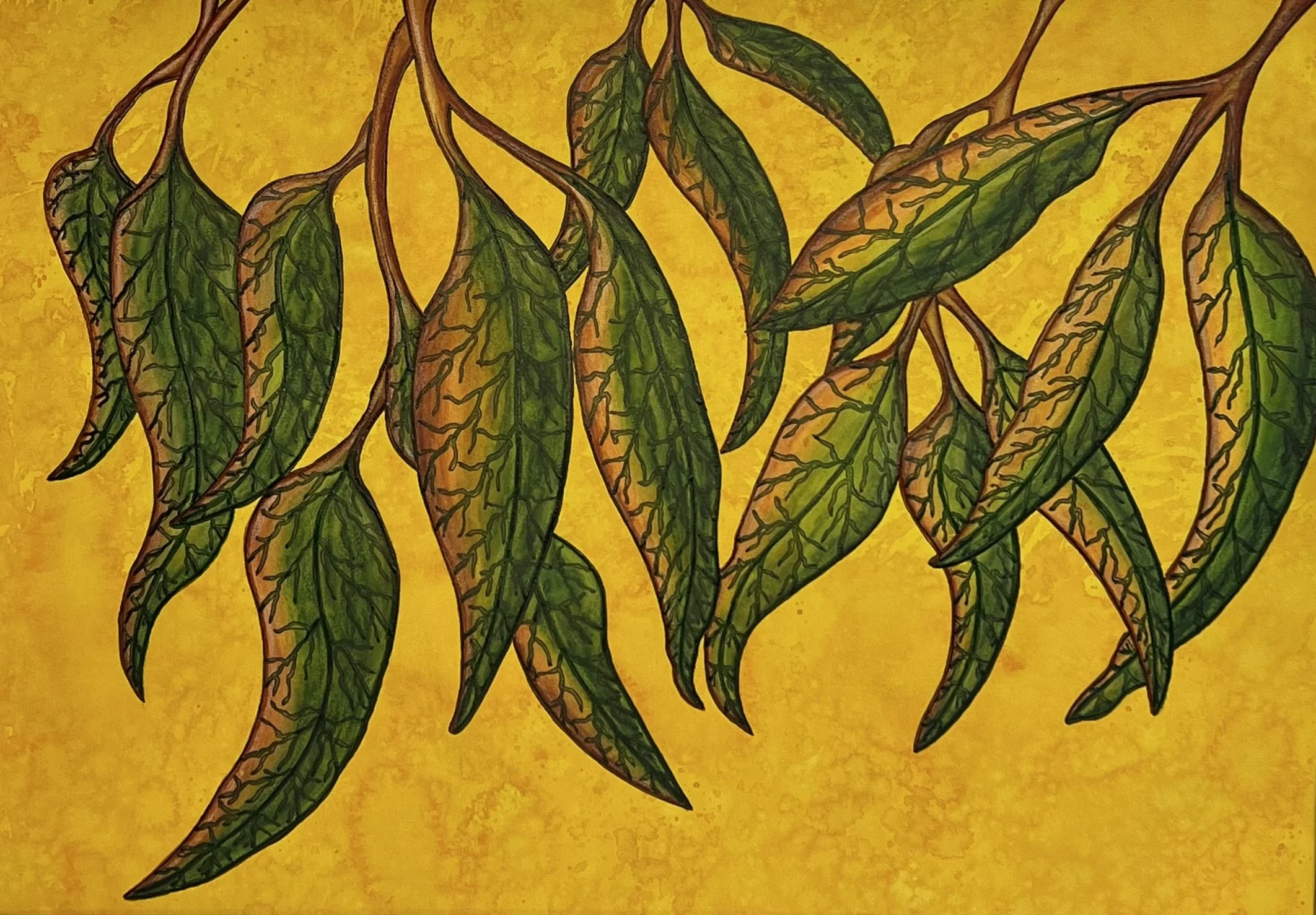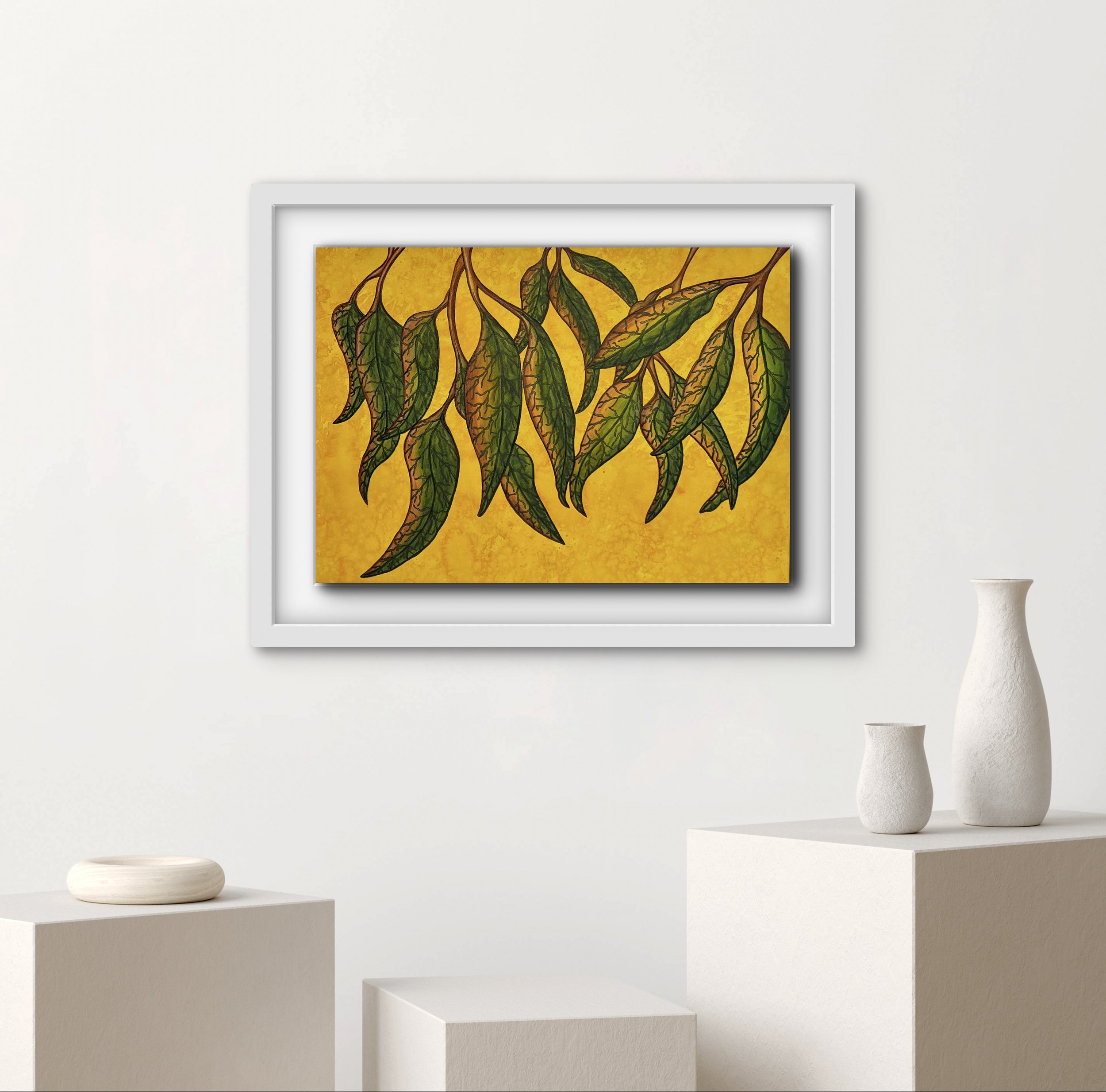 Golden Sky is the first in a series exploring the quiet elegance of eucalyptus leaves suspended against vibrant, exaggerated skies. The bold gold backdrop here is less about realism and more about presence — like the sky itself is humming. The intricate, almost exaggerated veins in the leaves are a nod to the subtle complexity we often miss in the familiar. It’s nature, seen through a heightened lens. A moment of stillness made luminous.